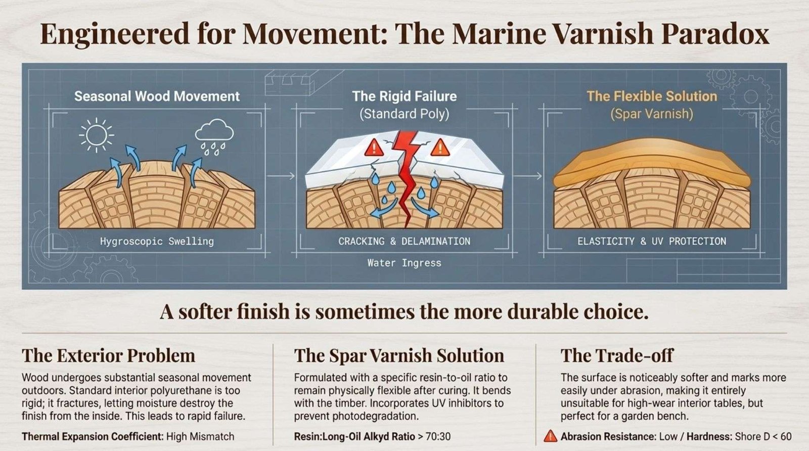 On an exterior window frame or a garden bench exposed to Australian summer conditions and winter rain, a rigid, high-hardness polyurethane will fail within a season. A flexible spar varnish applied in multiple coats and maintained with a light annual recoat will protect the same timber for years.