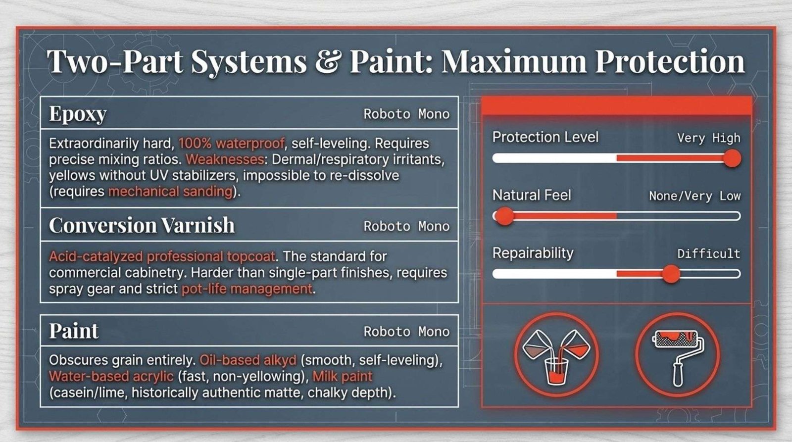 At the extreme end of the protection spectrum sit two-part reactive systems. Epoxy, as a finish material, cures through the chemical reaction between a liquid resin and a hardener mixed at a precise ratio.