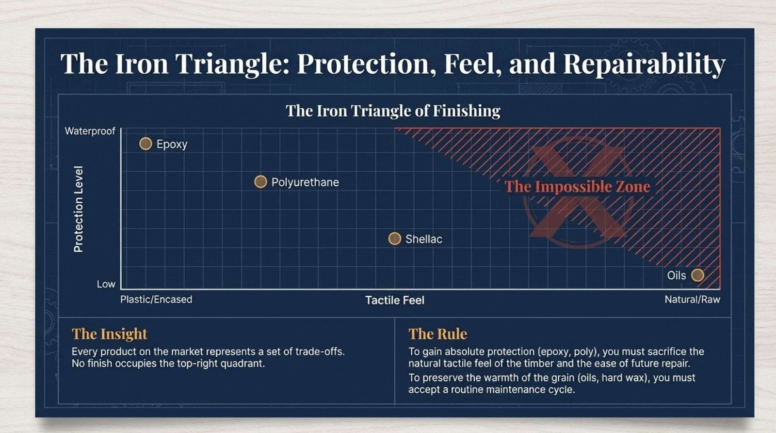 The hardest part of finishing is accepting that no single product does everything well. The most protective finishes are the least natural in feel. The most repairable finishes offer the least resistance to wear.