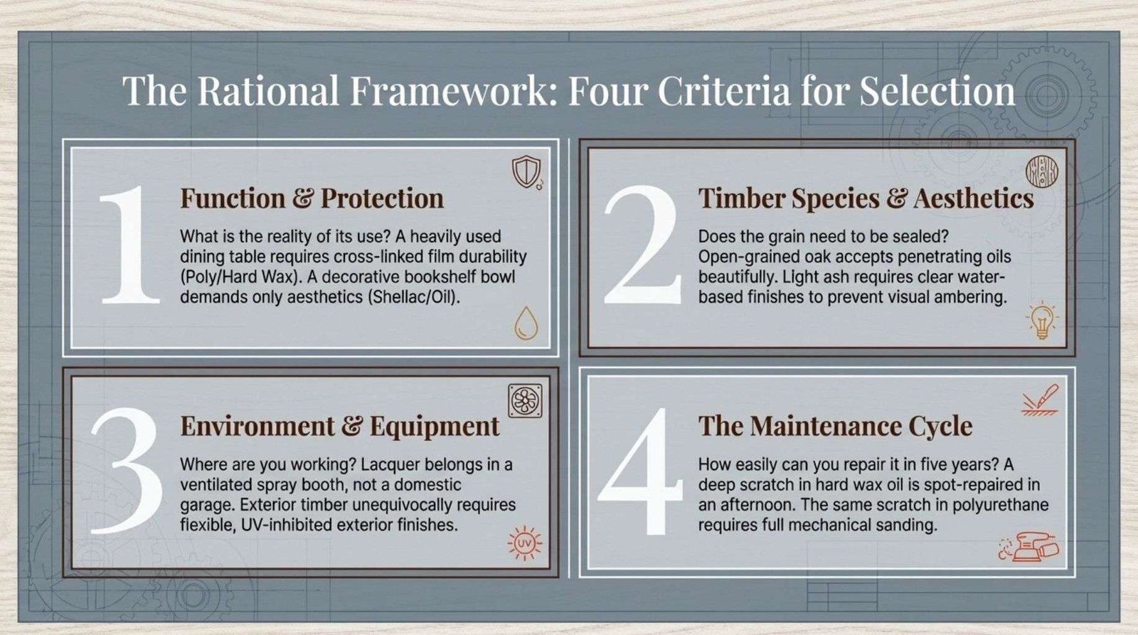 Four criteria should govern every finishing decision. Working through them in sequence reduces the choice from overwhelming to manageable.