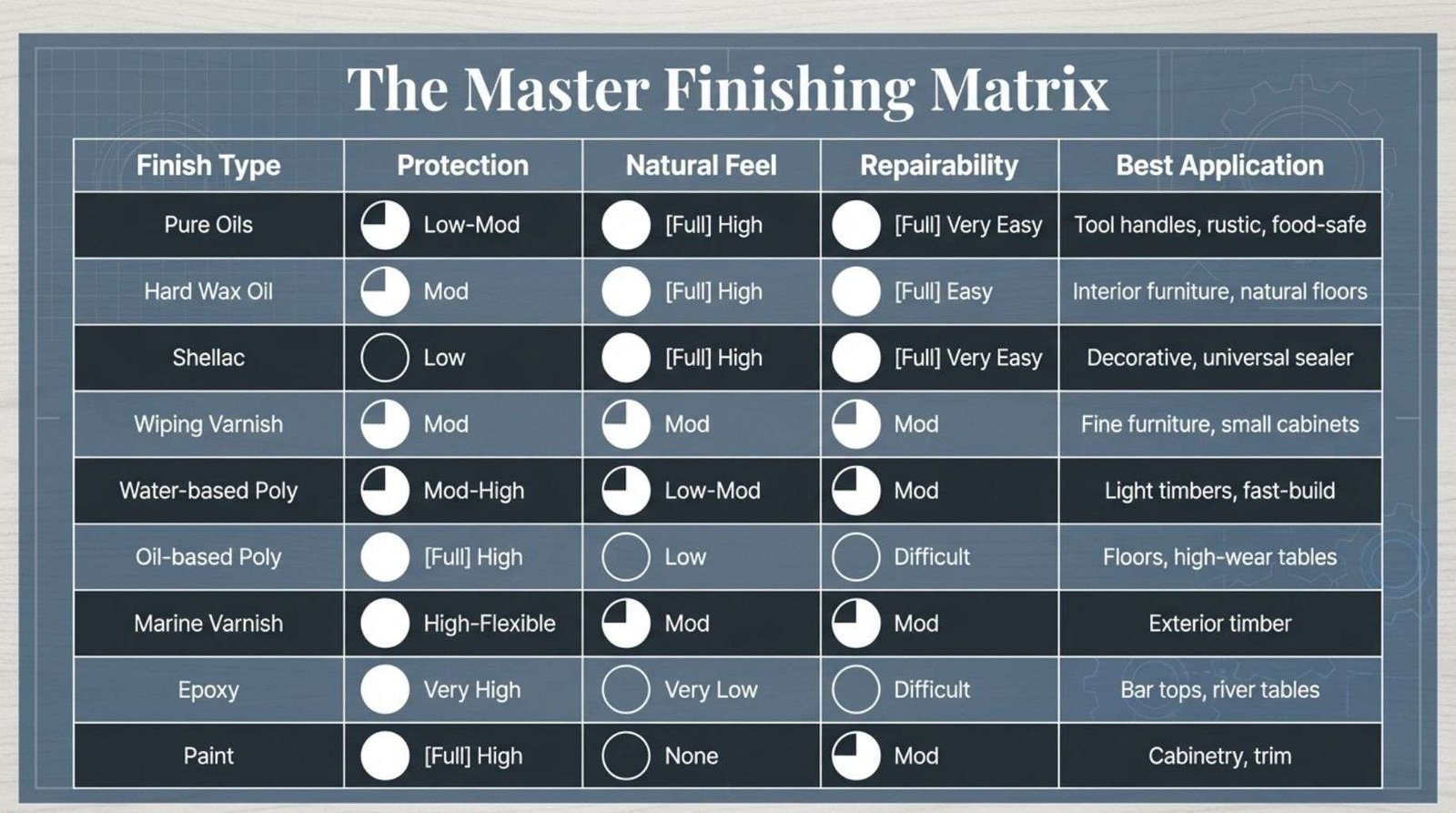 The fourth criterion, often underweighted, is repairability. A beautiful polyurethane finish on a kitchen table will eventually sustain damage.