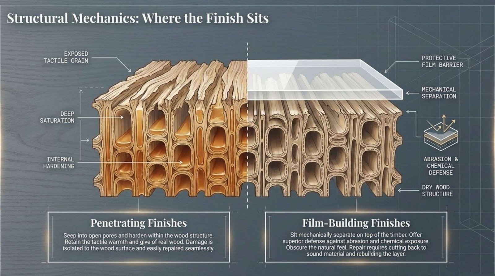 Finishes divide cleanly into two mechanical categories based on how they harden and where they sit in relation to the wood surface. Understanding this distinction cuts through a great deal of commercial noise.