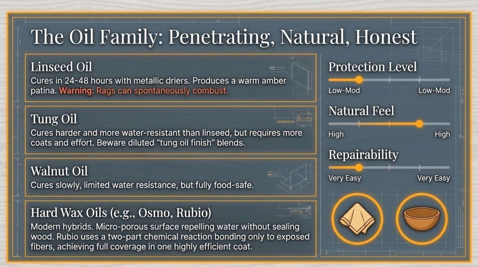 Pure oils (linseed, tung) | Low to moderate | High | Very easy | Tool handles, rustic furniture, food-safe surfaces |