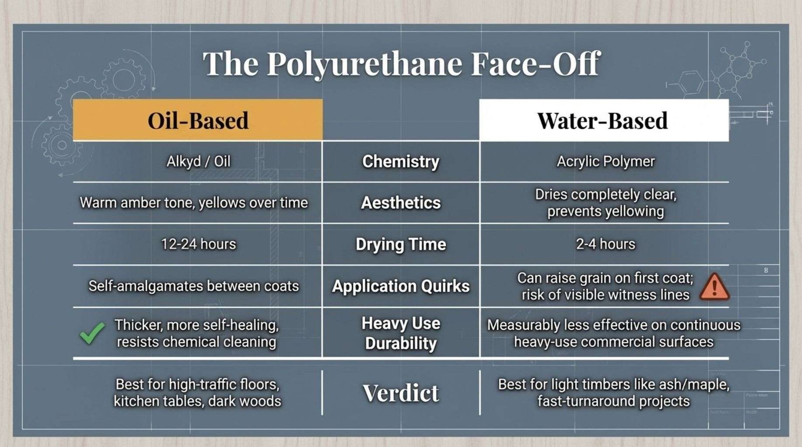 One practical trade-off that is specific and worth stating clearly: water-based polyurethane, despite its many genuine advantages, performs measurably less well than high-quality oil-based polyurethane on surfaces that experience continuous heavy use, such as commercial kitchen bench tops or high-traffic timber floors.