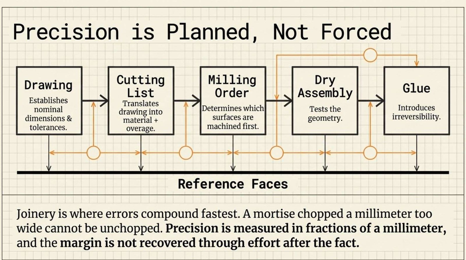 The feel of a chisel registering cleanly against a mortise wall. The resistance of dense hardwood against a well-set hand plane. The particular sound a joint makes when it is fully seated against the sound it makes when it is not quite there. These do not come through a screen.