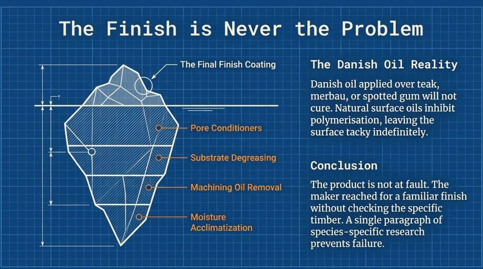 A specific example worth naming here. Danish oil applied over a surface that retains natural oils from a species like teak, merbau or spotted gum does not cure. The surface oils inhibit the polymerisation process and the product remains tacky, sometimes indefinitely, until it is removed and the substrate is properly cleaned and degreased before reapplication.