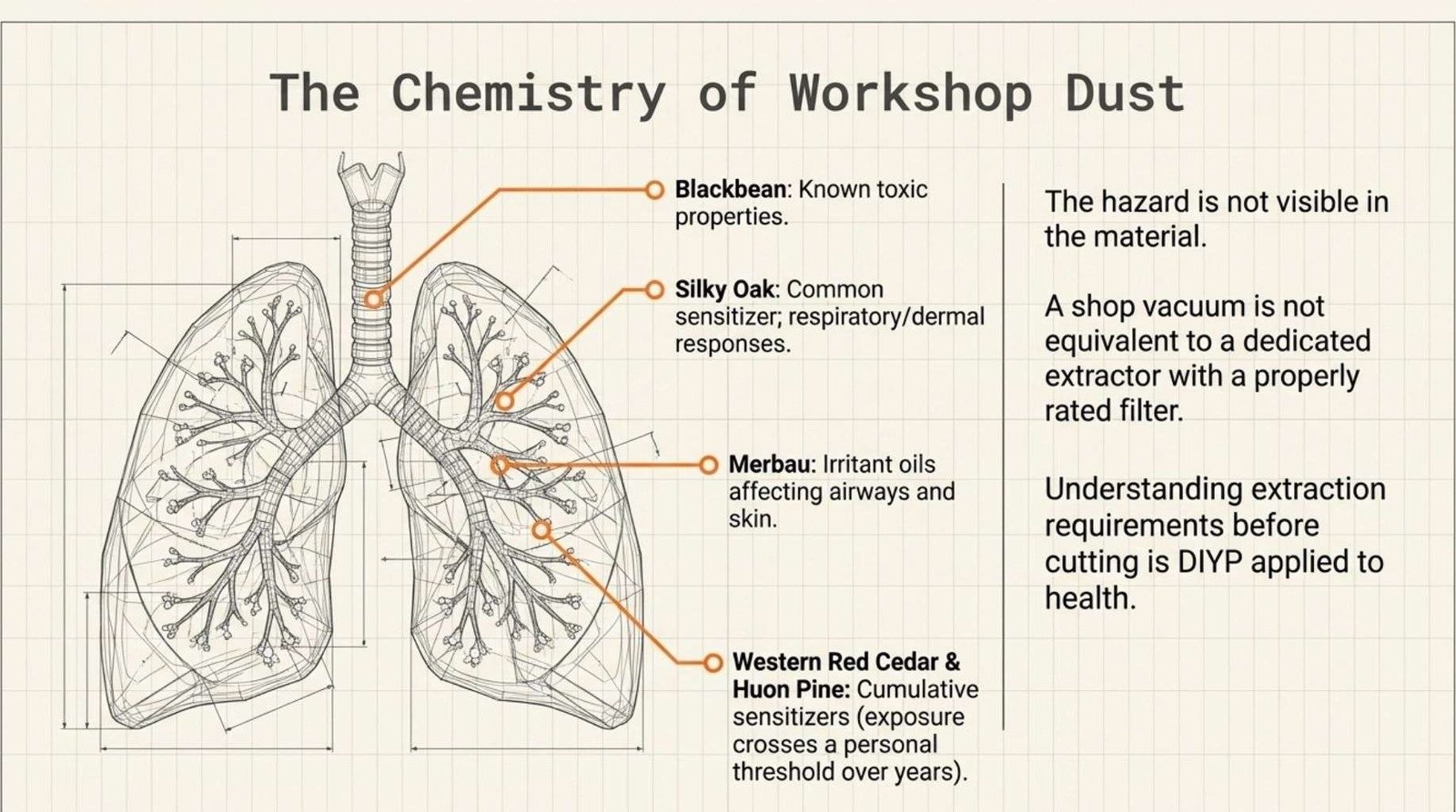 Merbau contains irritant oils that affect both the airways and the skin surface. Western red cedar and huon pine have well-established sensitisation records in makers who have worked those timbers without apparent issue for years before cumulative exposure crosses a personal threshold.
