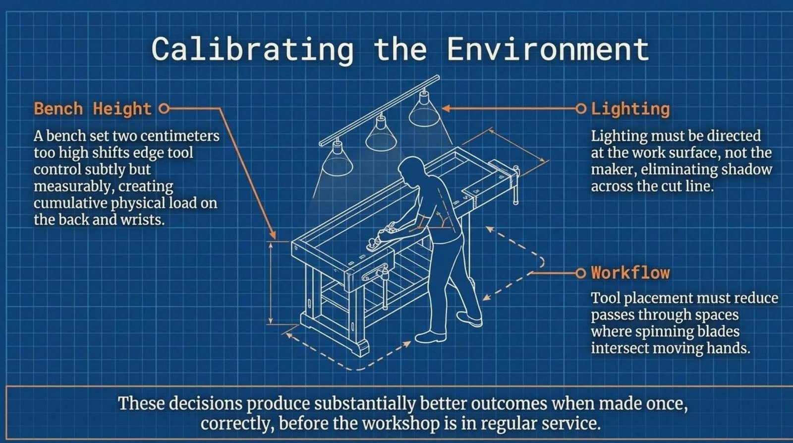 A bench set two centimetres too high shifts edge tool control subtly but measurably. Tool placement relative to workflow reduces the frequency of passes through a space where a spinning blade or moving part could intersect a moving hand.