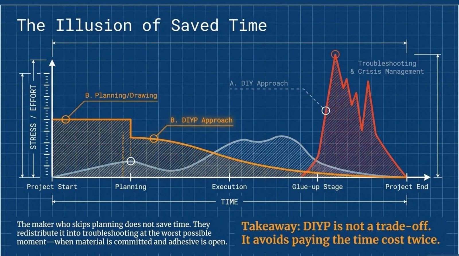 Here is the trade-off that experienced woodworkers accept and beginners resist. A properly planned project takes longer than a loosely planned one at every stage except the final glue-up. The drawing takes time.