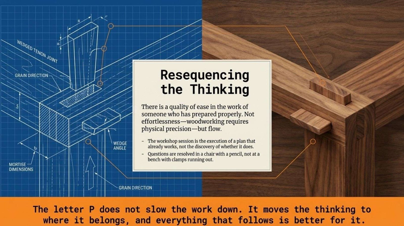 It is the resequencing of the thinking so that it precedes the doing, so that the questions are resolved in a chair with a pencil and a species guide rather than at a bench with glue in play and clamps running out.