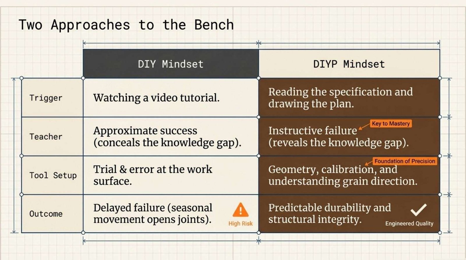 This article is about that relationship. It is about what proper preparation actually means across the full arc of a woodworking project, from the research that should precede a tool purchase to the knowledge that determines whether a finish holds or fails. The workshop is the best possible classroom for the DIYP principle, and its lessons apply well beyond it.