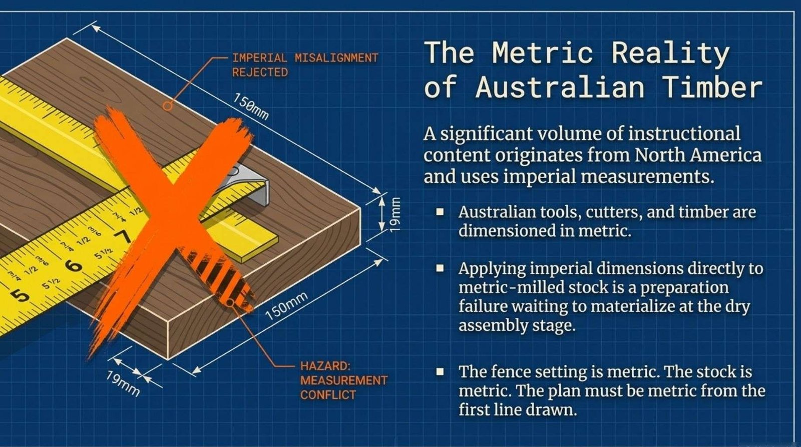 Applying those dimensions directly to Australian-milled stock without conversion is a preparation failure waiting to materialise at the dry assembly stage.