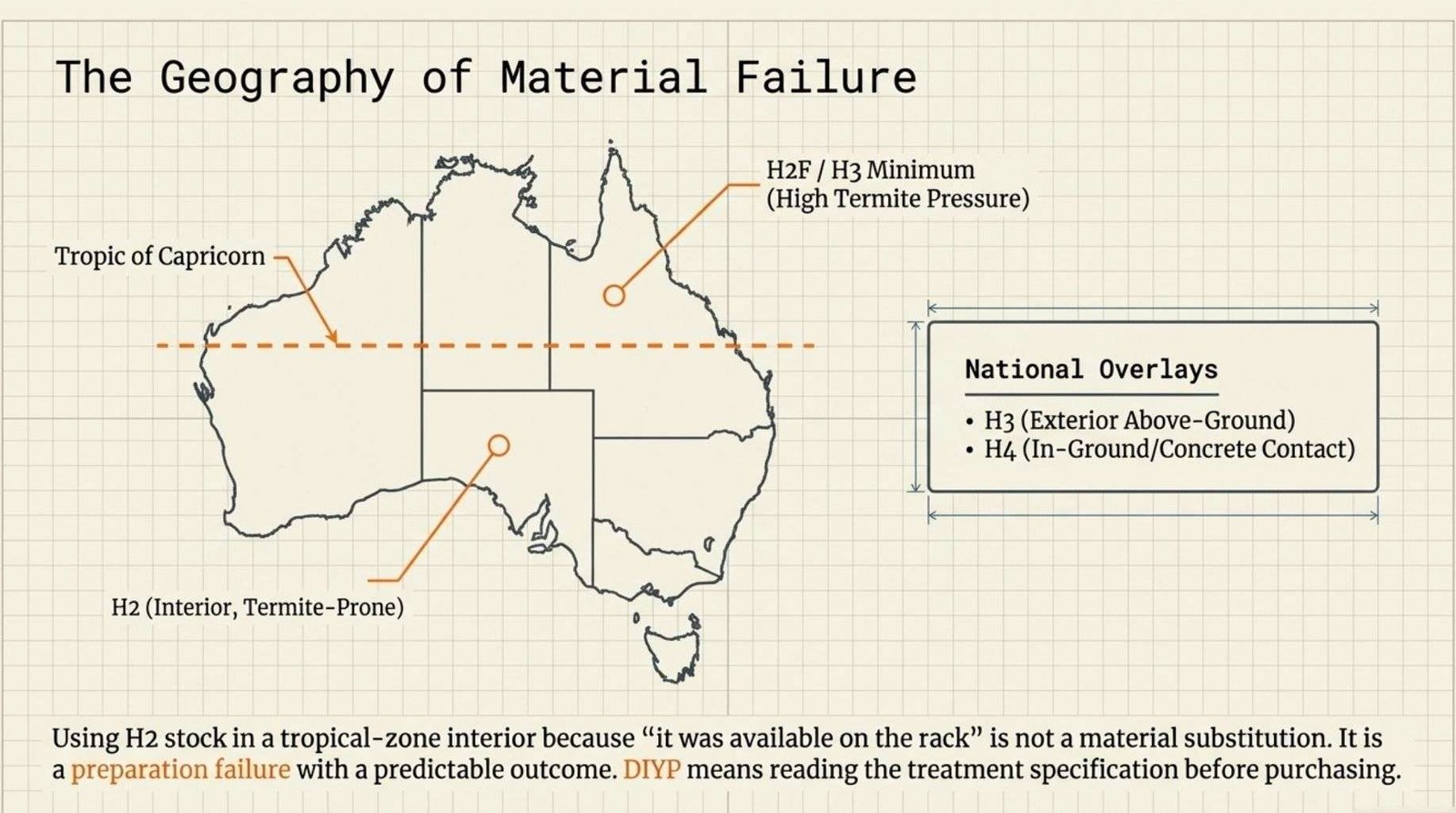 Timber treatment classes in this country are specific and consequential. H2 treated pine is designated for interior applications in termite-prone areas south of the Tropic of Capricorn. North of that line, H2F or H3 is required even for interior above-ground use, because the termite pressure is substantially higher.
