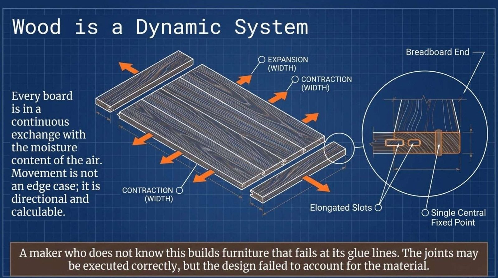 The piece looks fine on the bench, moves into the house, and the problem declares itself months later when seasonal movement that was never accounted for has opened a joint or distorted a panel.
