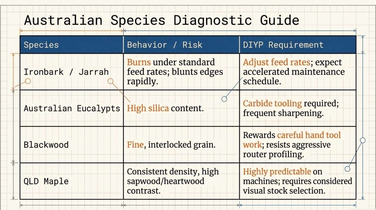 Understanding a species before working it extends beyond movement. Ironbark and jarrah are among the most demanding Australian hardwoods in this respect: both are notorious for burning under router bits and saw blades run at standard feed rates, and both blunt cutting edges at a rate that surprises makers accustomed to softer domestic timbers.