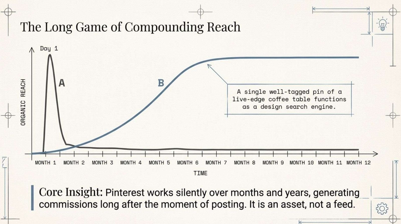 A single well-tagged pin of a live-edge coffee table can generate enquiries twelve months after it was posted.