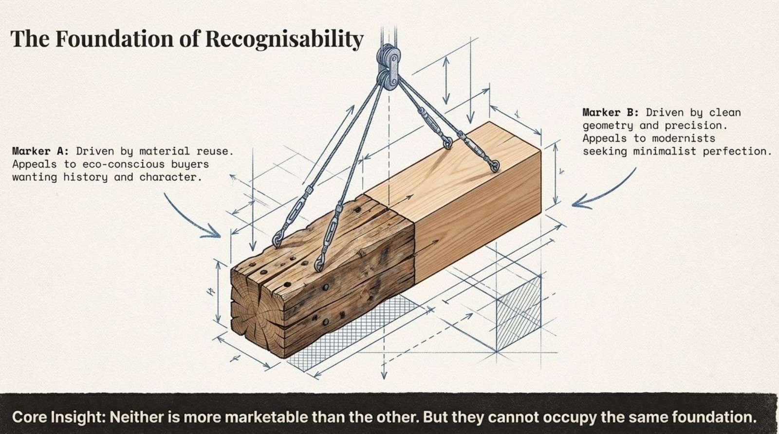 A woodworker drawn to reclaimed timber by a genuine belief in material reuse will build a very different brand from one who trained in a Danish workshop and works exclusively in white oak and clean geometry. Neither is more marketable than the other, but each requires a different audience.