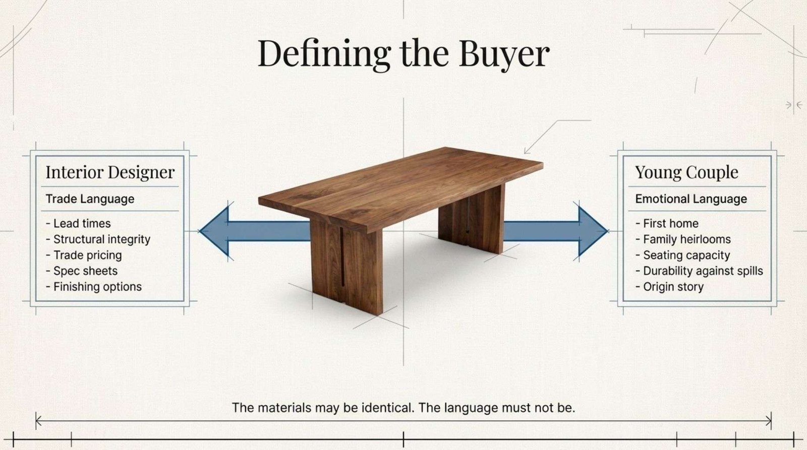 A furniture maker targeting interior designers requires a very different voice and visual register than one selling directly to young couples furnishing their first home. The materials may be identical. The language must not be.