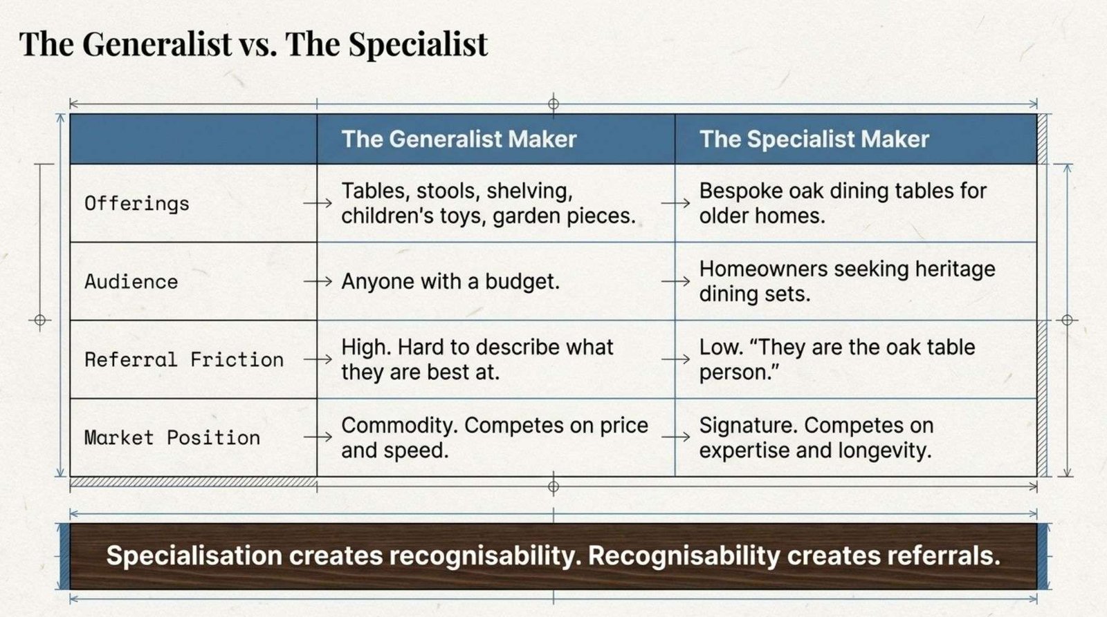 Niching down feels counterintuitive at first. Surely a wider offer means more customers. In practice, a maker known for bespoke oak dining tables for older homes will be recommended far more readily than one who makes tables, stools, shelving, children’s furniture and garden pieces with equal indifference.