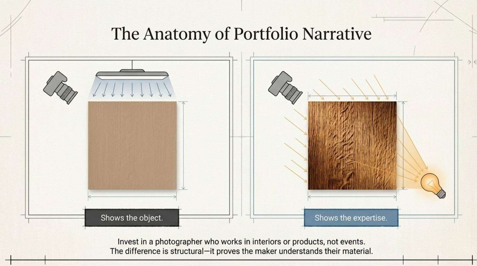 The second image shows more. It shows the maker understands their material. Invest in a half-day with a photographer who works in interiors or product, not events. The difference is structural.