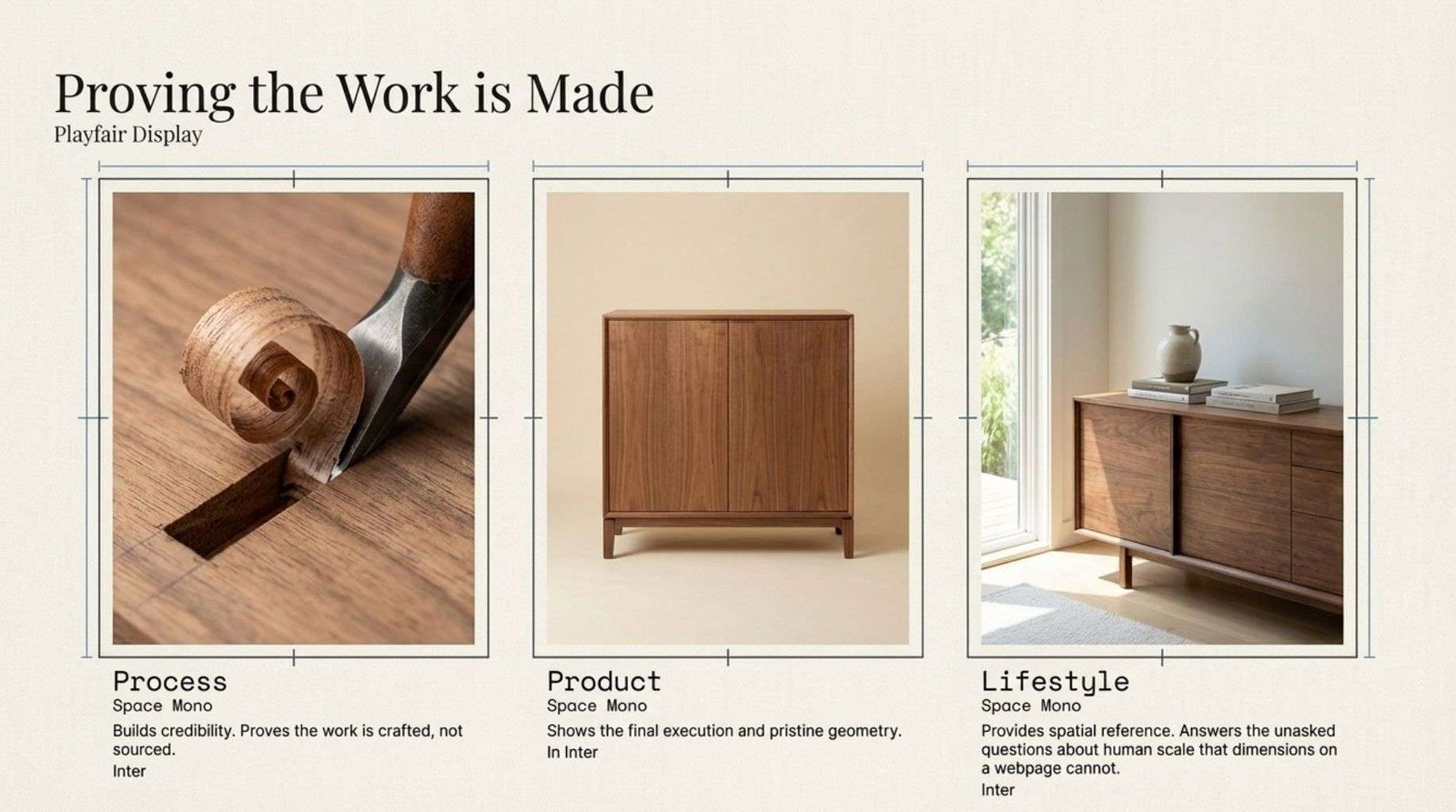 Photography carries the most weight of any visual element. The grain of quarter-sawn oak reads entirely differently under flat overcast light than it does under a single warm bulb raking across the surface at a low angle.