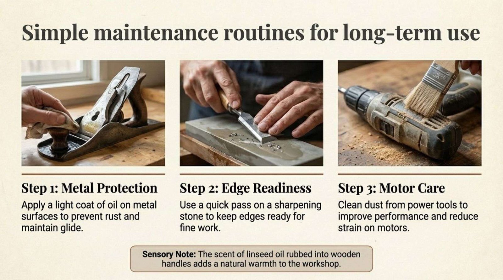 The scent of linseed oil on wooden handles adds a natural warmth to the workshop. Cleaning dust from power tools improves performance and reduces strain on motors. Maintenance routines do not need to be complex.