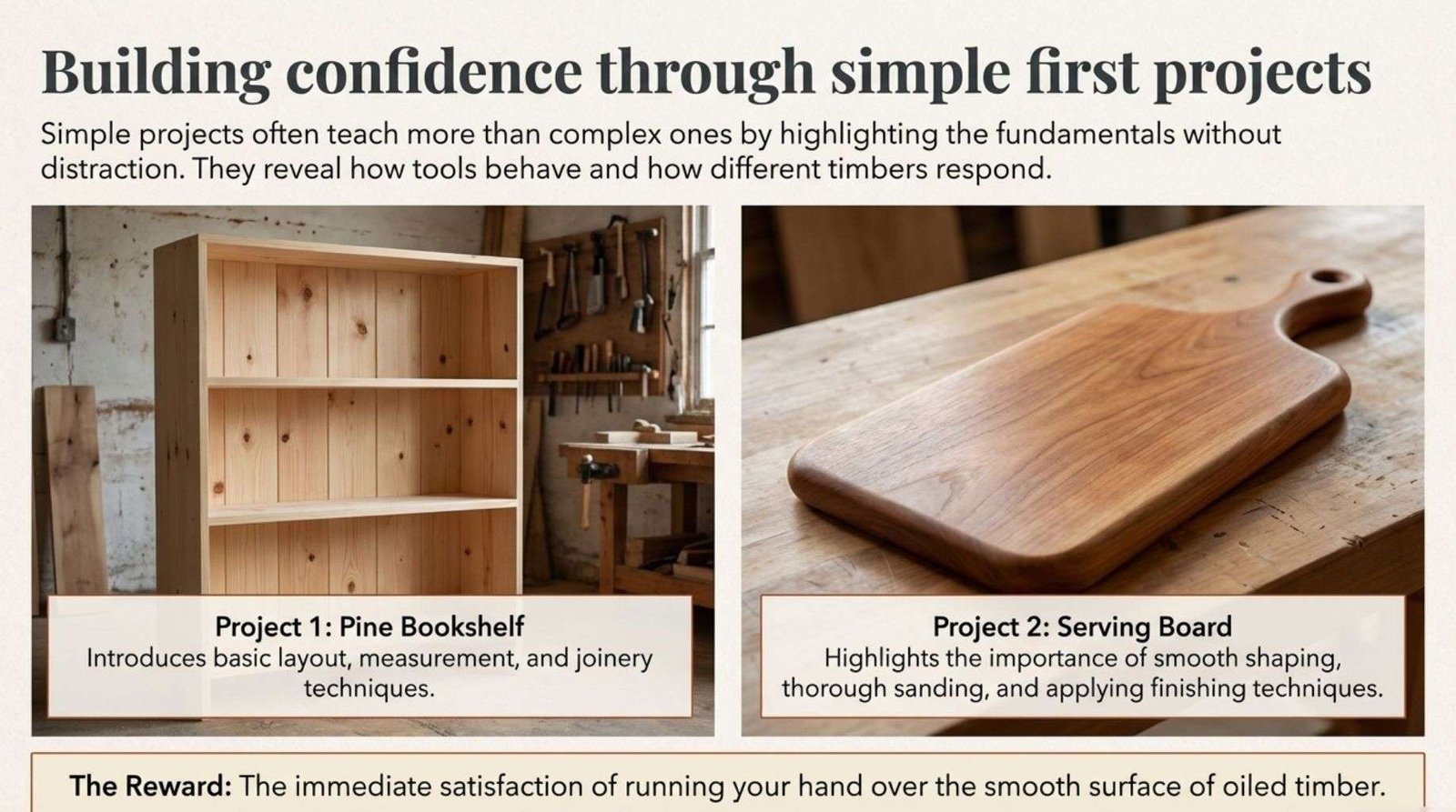 A pine bookshelf introduces basic joinery while a serving board highlights sanding and finishing techniques.