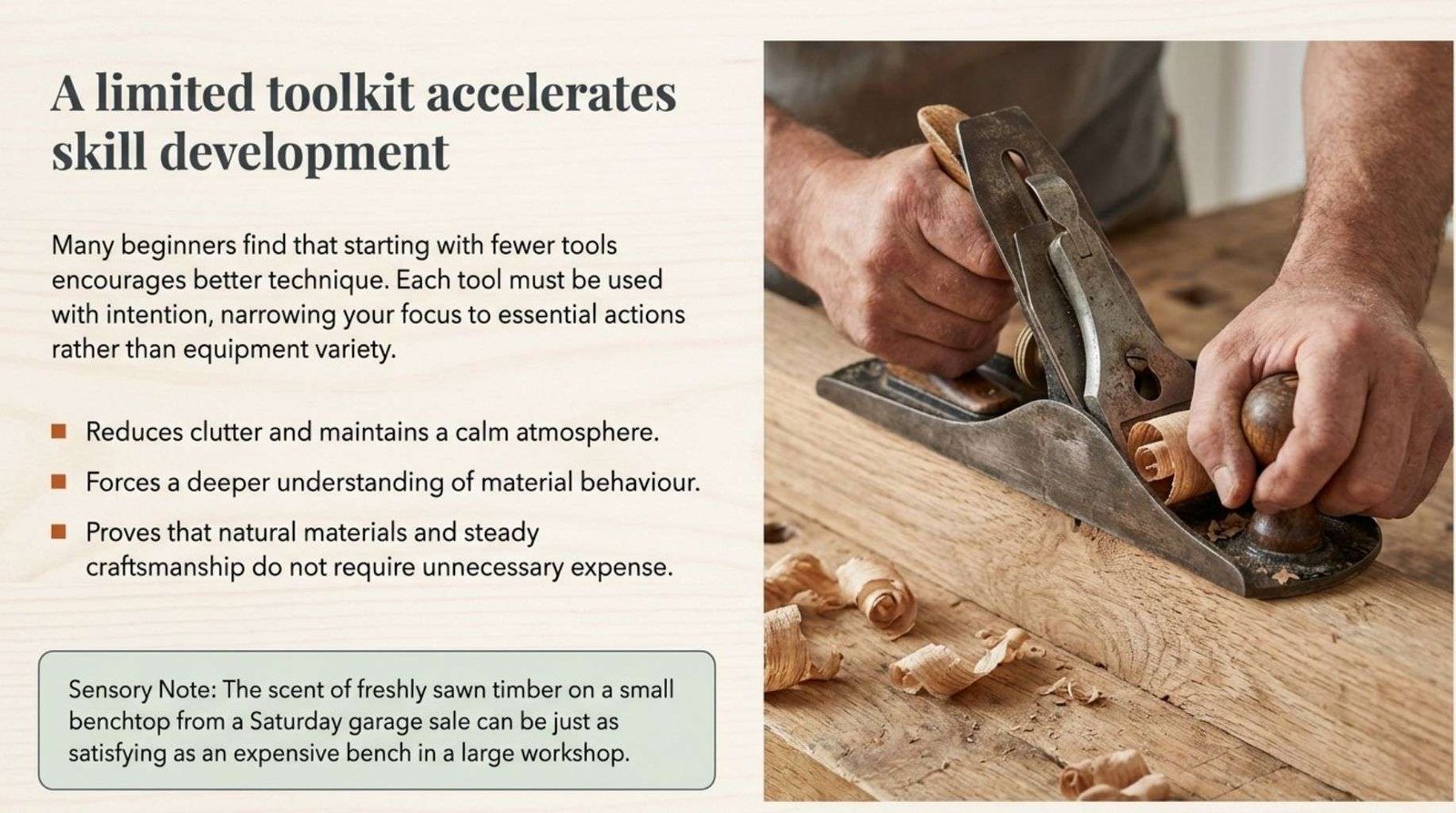 A modest collection of well-chosen tools encourages steady skill development and a calm working environment.