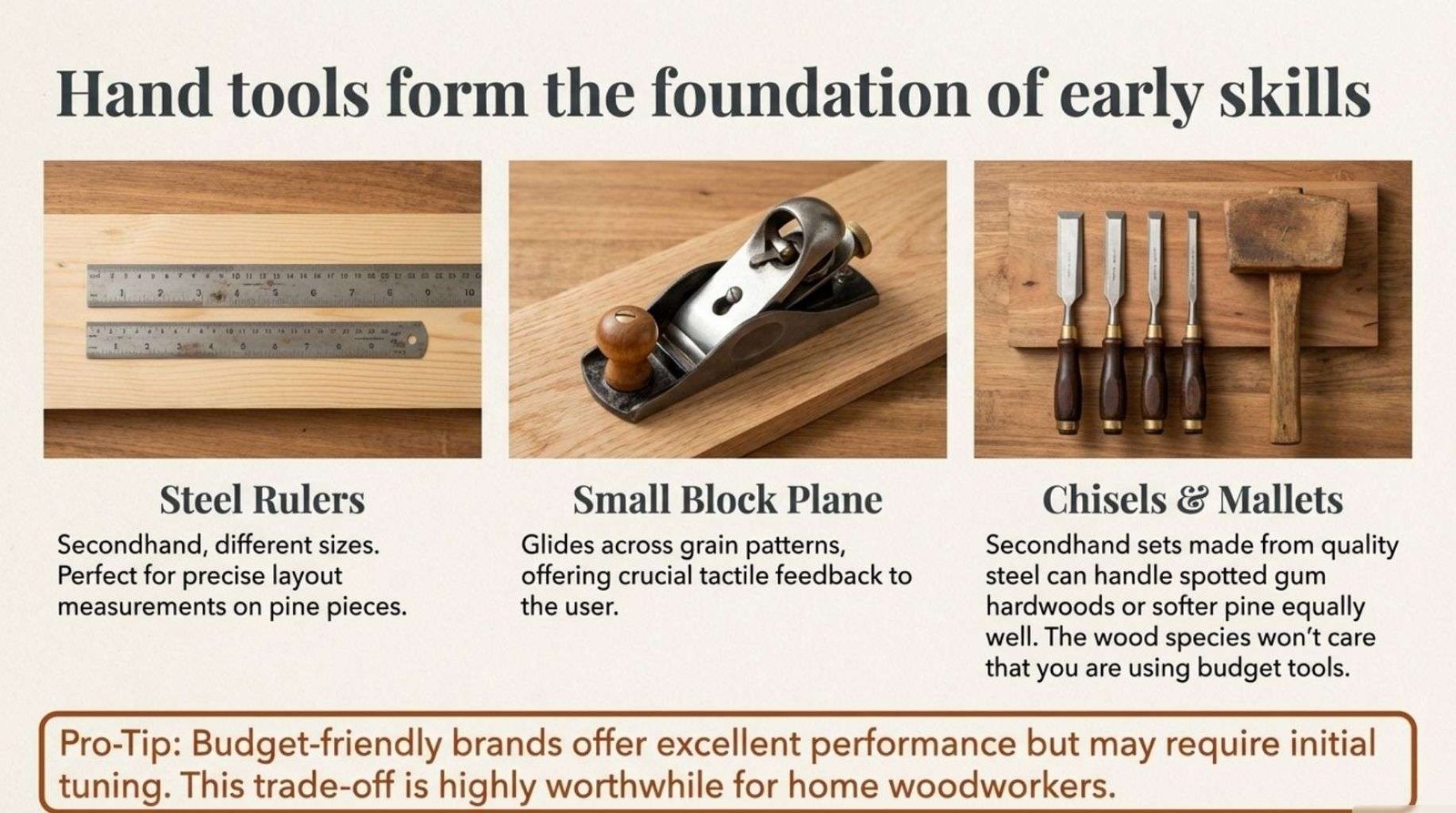 A small block plane offers tactile feedback as it glides across grain patterns. These tools support foundational habits that influence every future project.