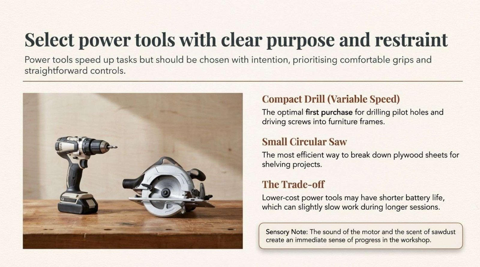 The sound of the motor and the scent of sawdust create a sense of progress in the workshop. It is helpful to choose tools with comfortable grips and straightforward controls. A limitation to consider is that lower-cost power tools may have shorter battery life which can slow work during longer sessions.