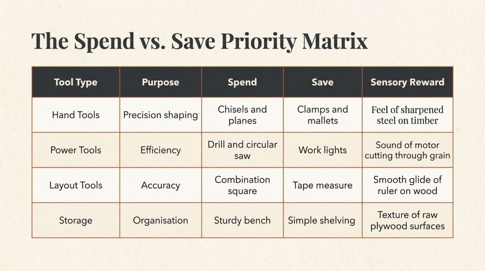A careful approach to tool selection purchases encourages clarity about what is genuinely useful. The scent of freshly sawn timber on a small benchtop you got from a Saturday garage sale in your shed can be just as satisfying as any expensive bench in a large workshop.