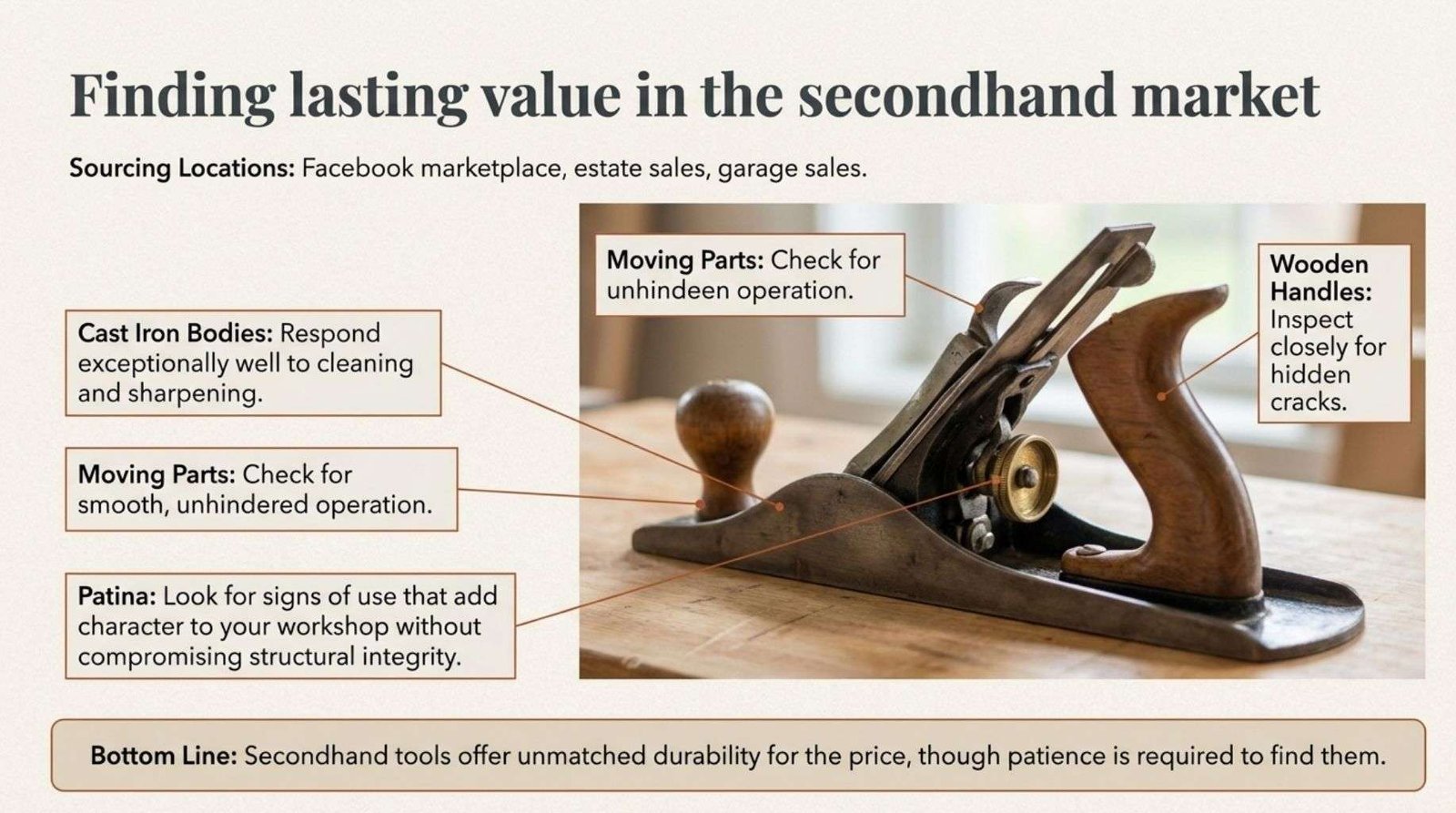 Secondhand markets offer opportunities to acquire quality tools at reduced prices. Many older hand planes have cast iron bodies that respond well to cleaning and sharpening.