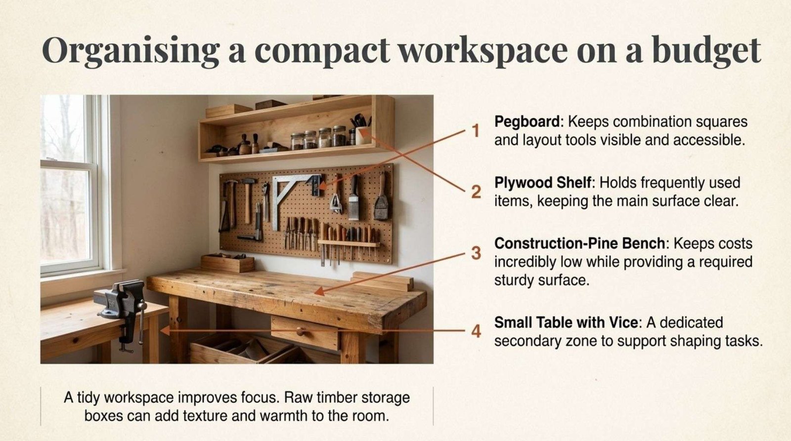 A small table with a vice can support shaping tasks. The limitation of a compact workshop is reduced space for large projects although careful planning allows most home-scale builds to proceed smoothly.