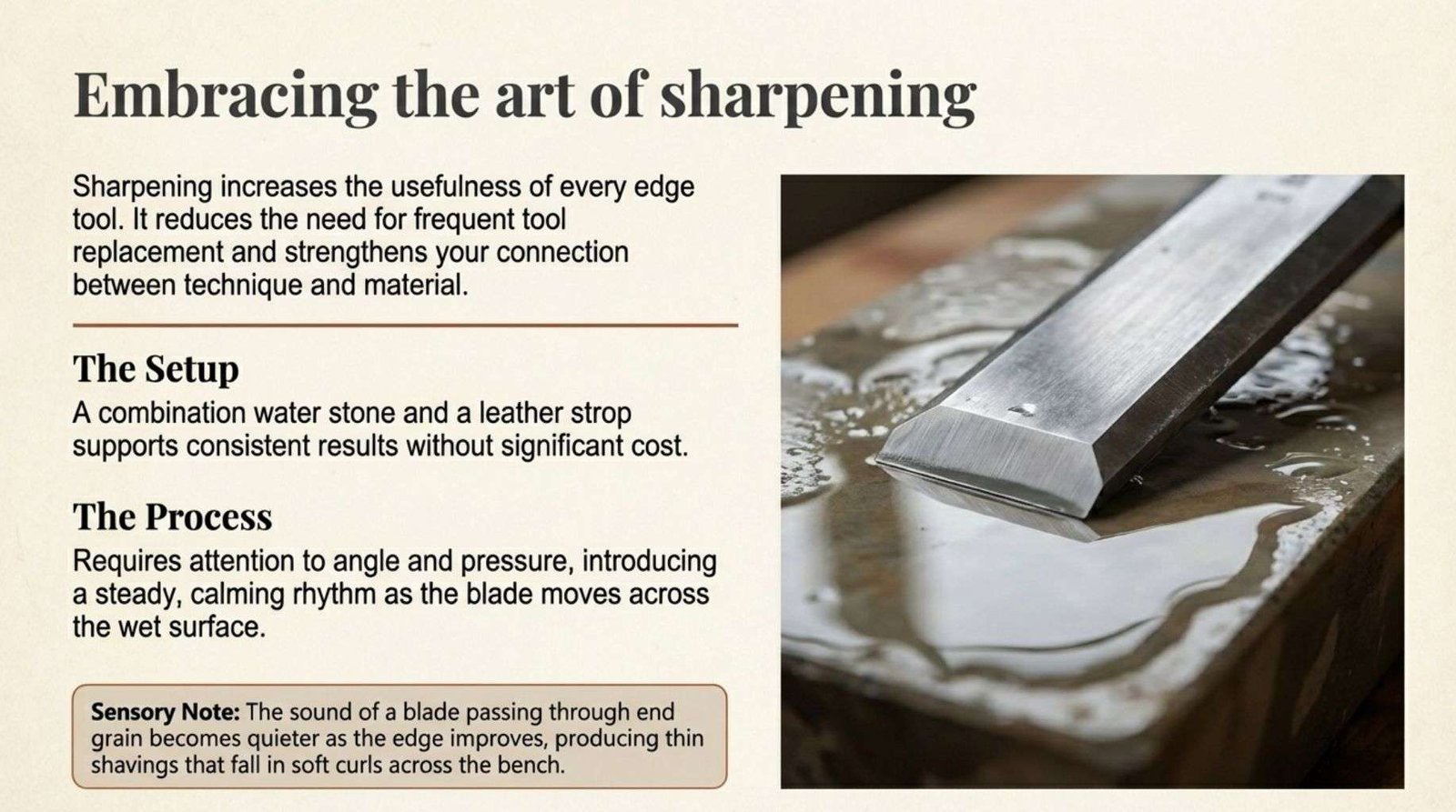 The sound of a blade passing through end grain becomes quieter as the edge improves. A simple setup with a combination water stone and a leather strop supports consistent results without significant cost.