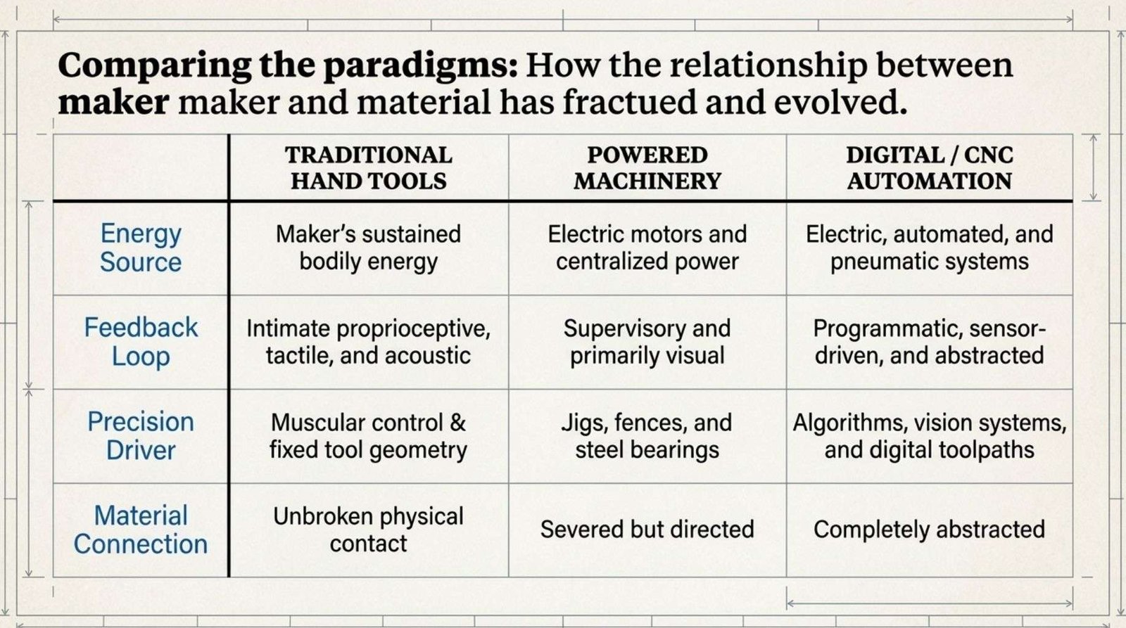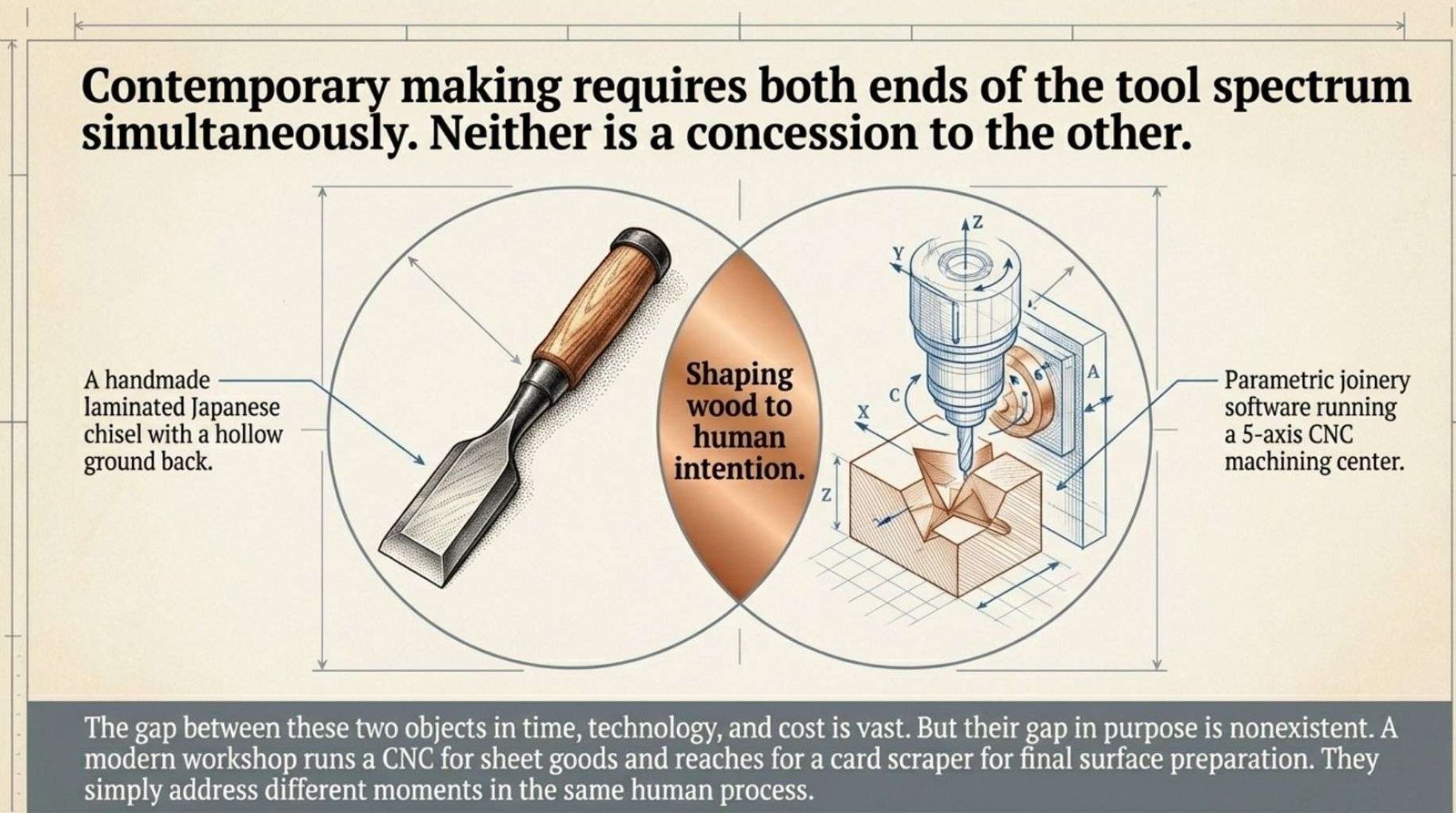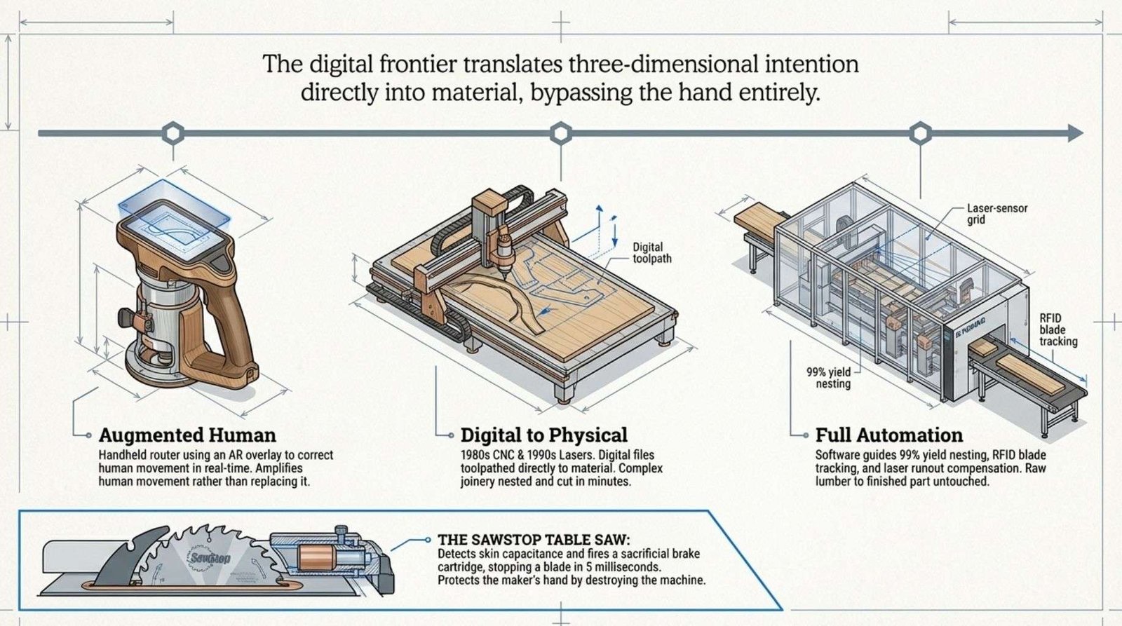 Woodworking sits at an interesting point in this history because it requires both ends of the tool spectrum simultaneously.