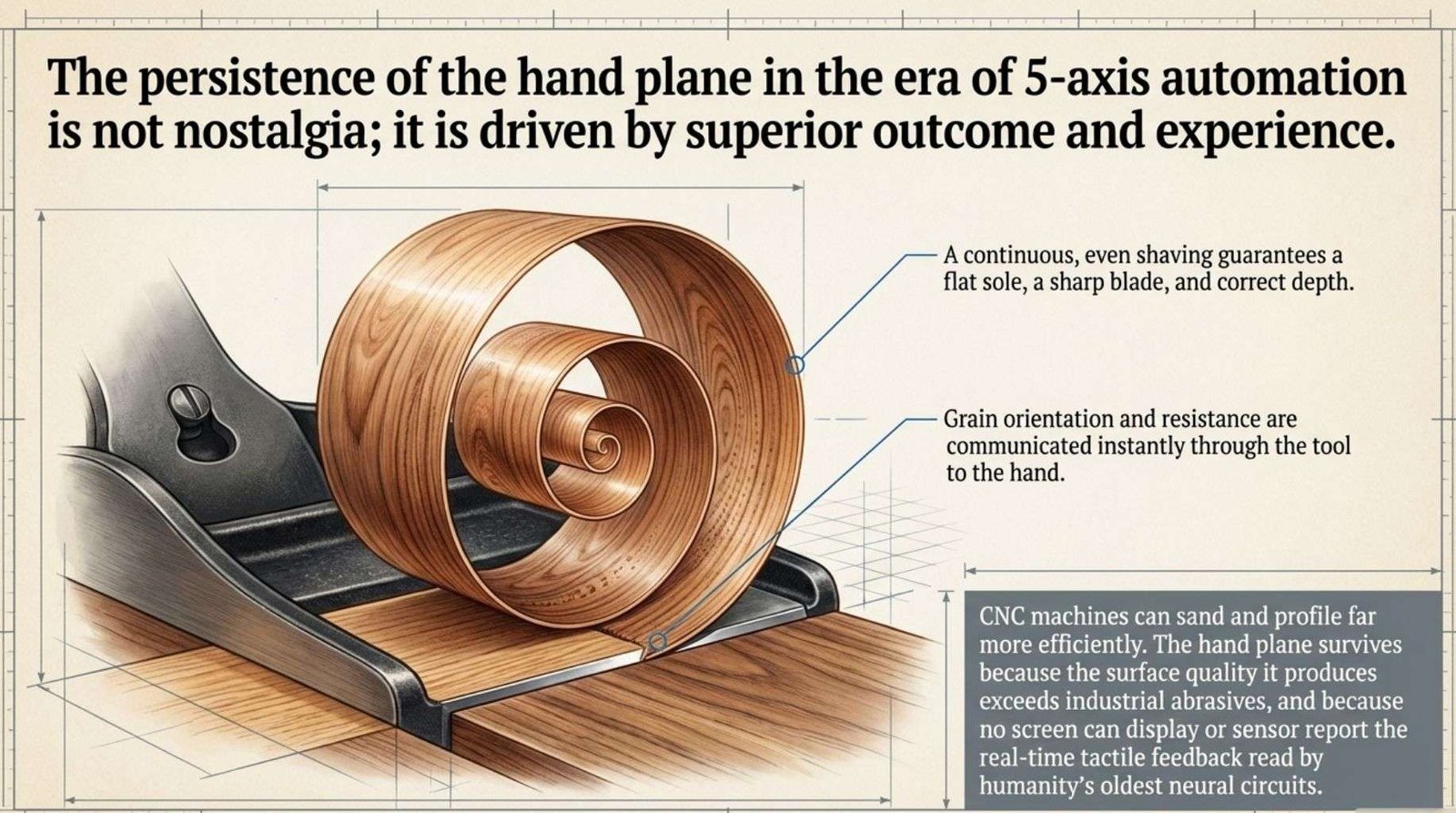 The hand plane has persisted not because it is the most efficient surface preparation tool, but because the quality of surface it produces at its best exceeds what abrasives achieve, and because the connection it creates between maker and material is not duplicable by machine.