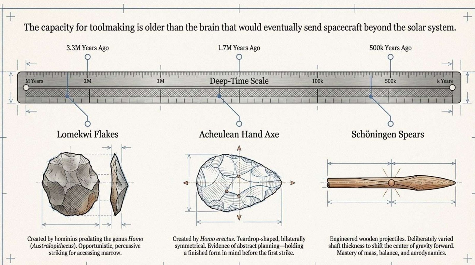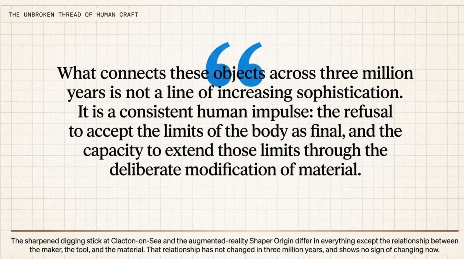 What connects these objects across three million years is not a line of increasing sophistication. It is a consistent human impulse: the refusal to accept the limits of the body as final, and the capacity to extend those limits through the deliberate modification of material.