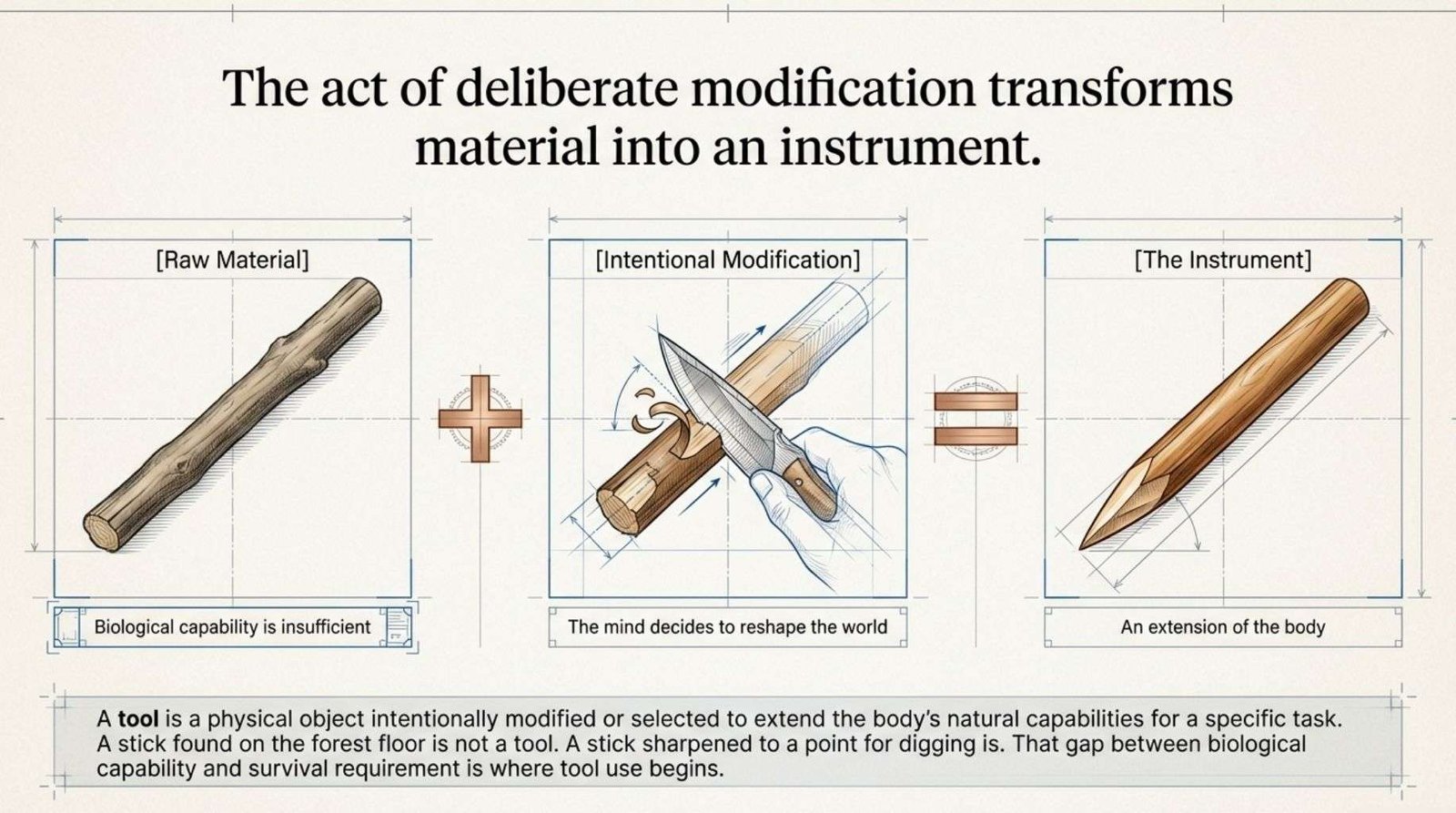 That last part matters as a stick found on the forest floor is not a tool but a stick sharpened to a point for digging is. The act of deliberate modification is what transforms material into instrument.