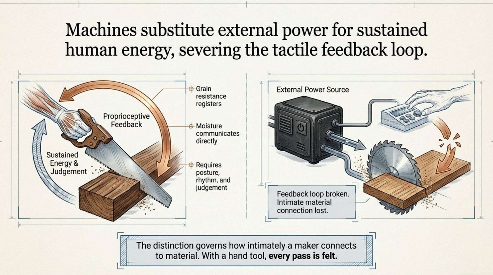 A panel saw with a motorised carriage substitutes an external power source for most of that. The distinction matters in a workshop context because it governs how intimately a maker is connected to the material.