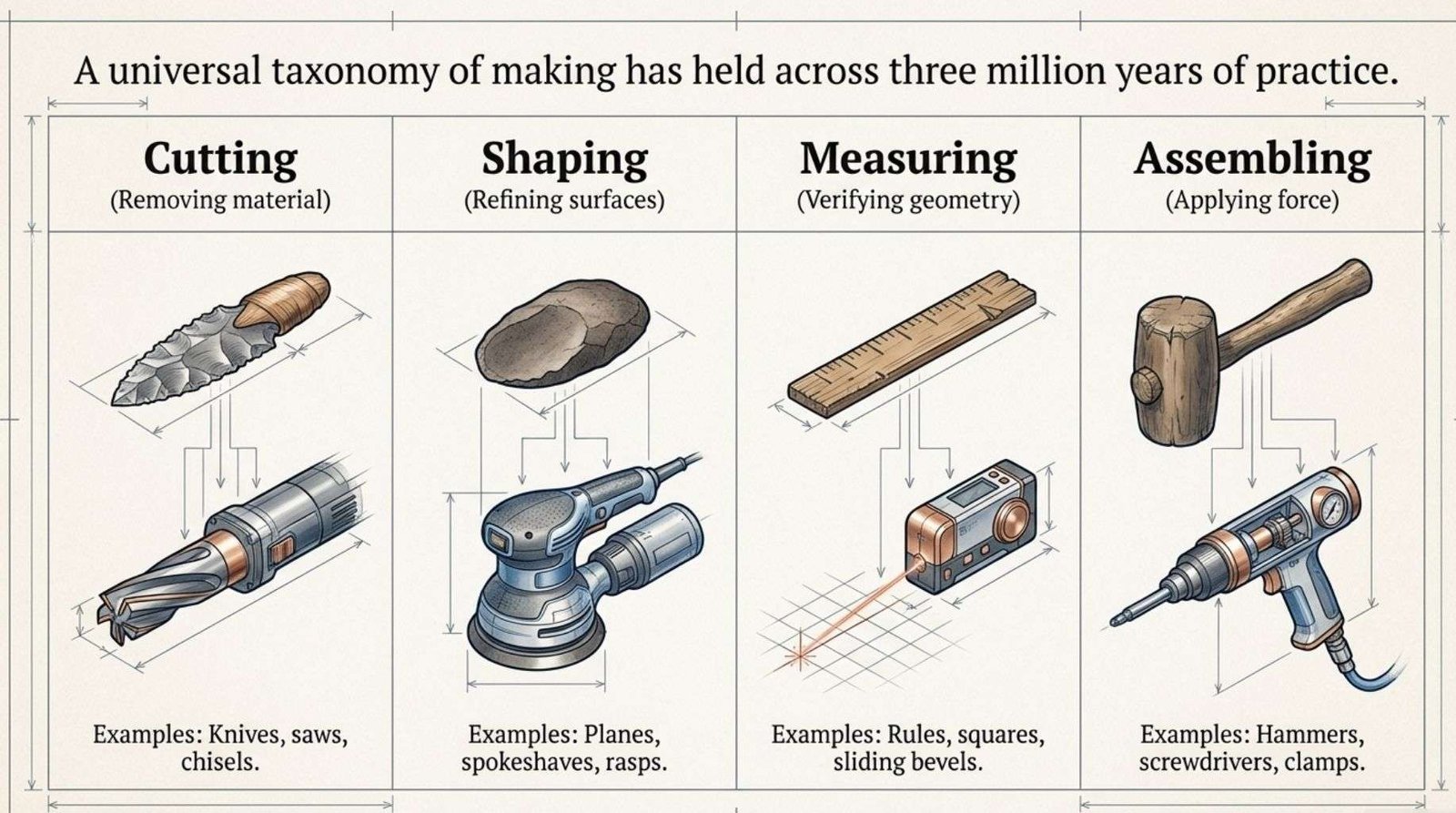 Assembling tools drive fixings or apply force: hammers, mallets, screwdrivers, and clamps. This taxonomy holds across three million years of making, from a fractured flint to a carbide-tipped router bit spinning at 24,000 RPM.