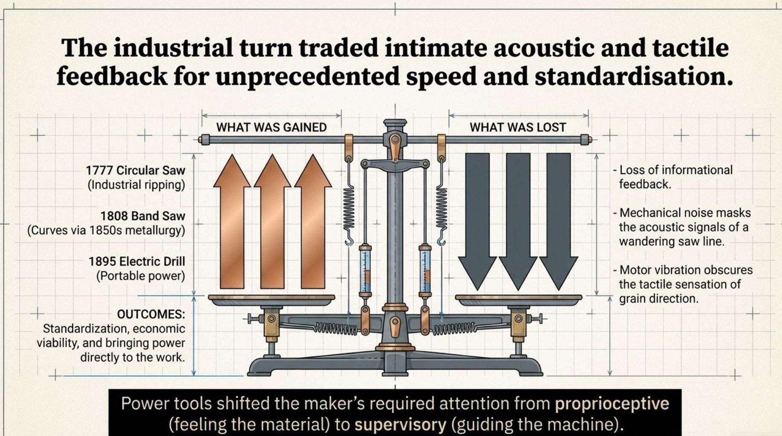 The loss was informational. Power tools are louder, which masks the acoustic feedback that a hand saw provides when it wanders off line.
