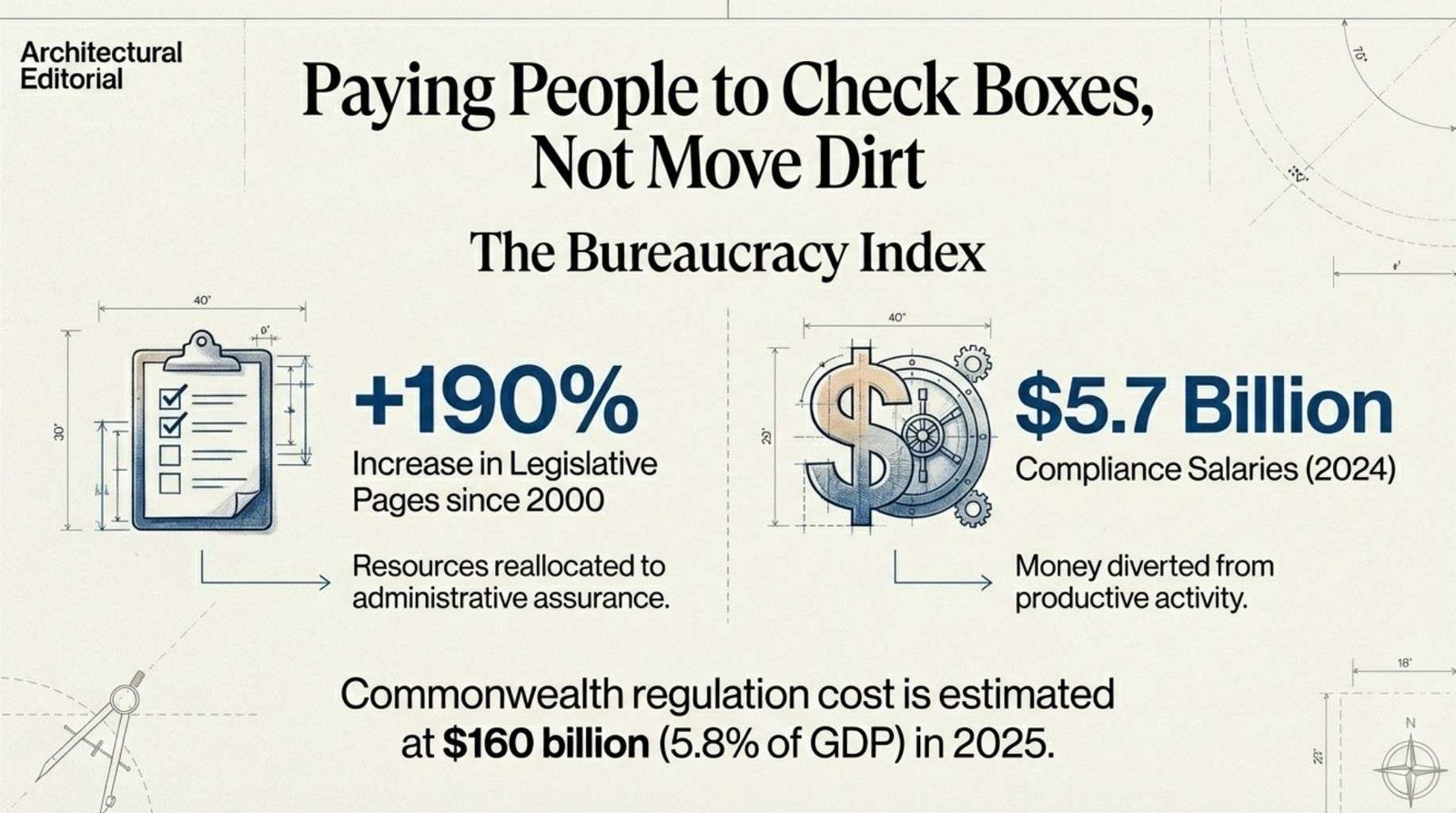 2. A 2025 Mandala Partners report estimated the cost of meeting Commonwealth regulation at $160 billion, or 5.8% of GDP, up from $65 billion in 2013.