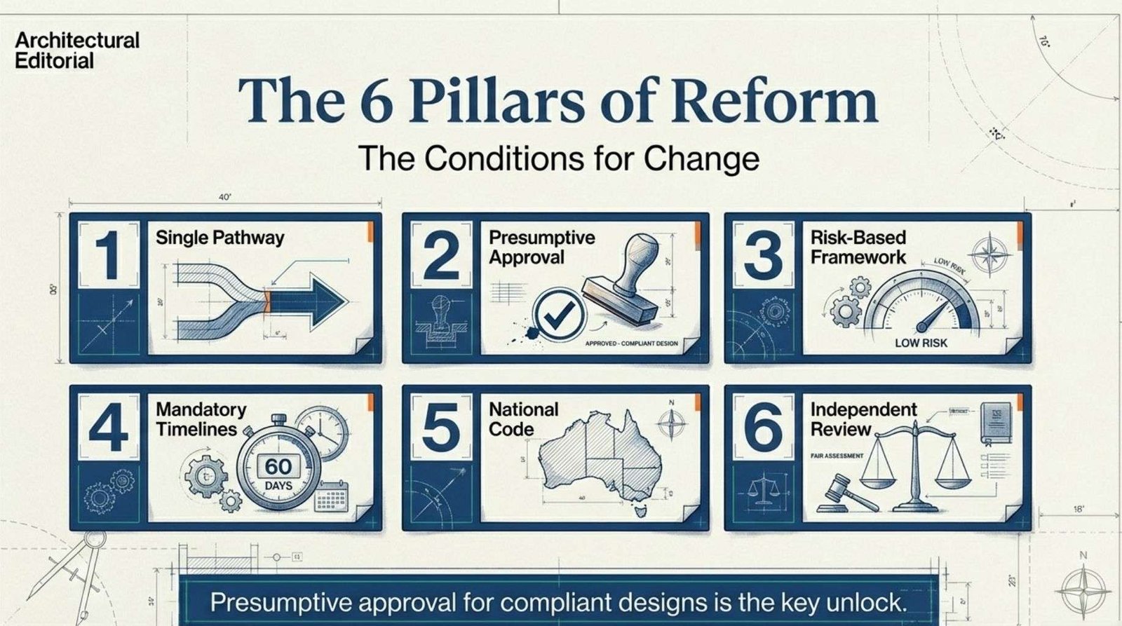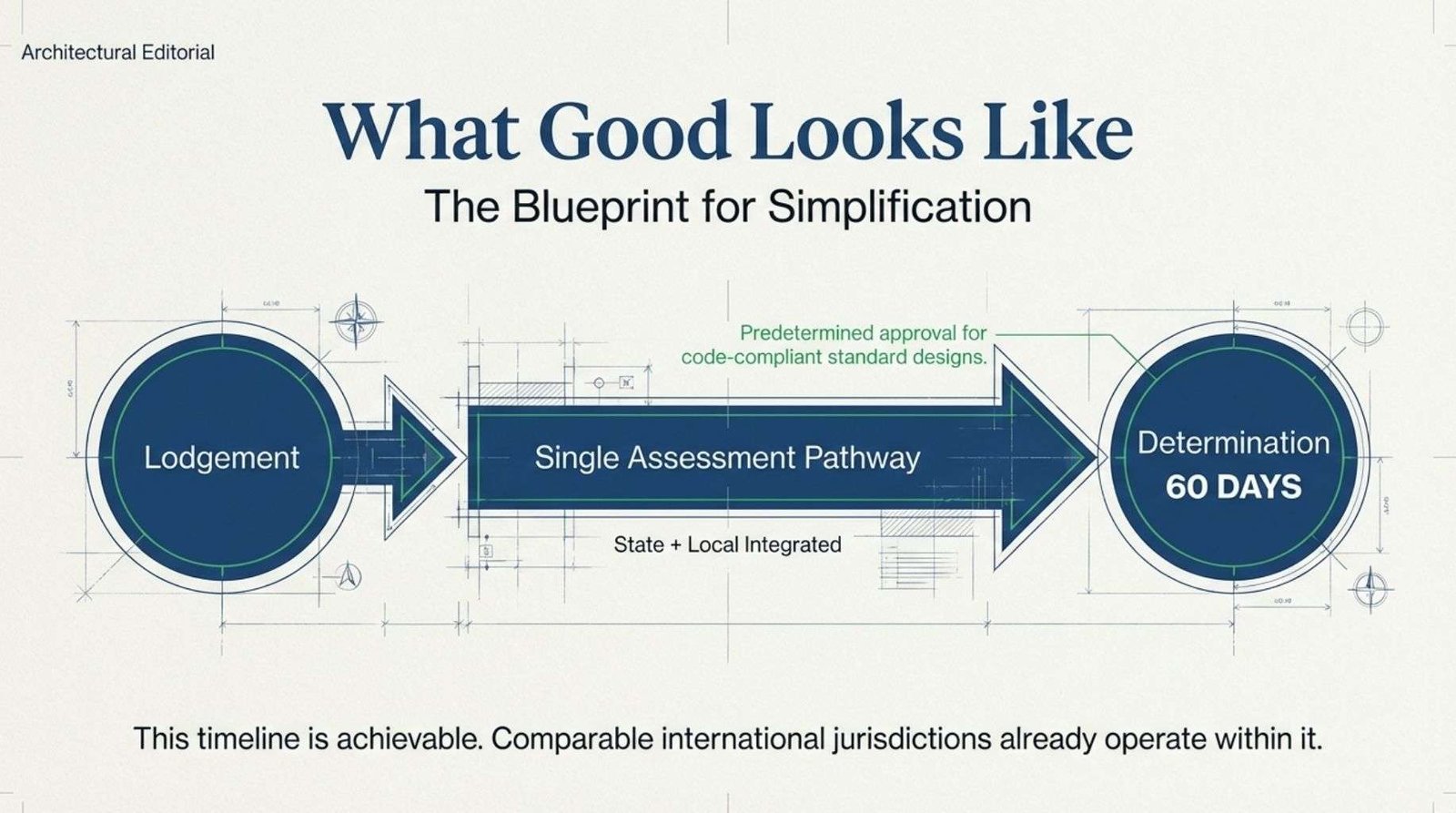 The conditions that make it achievable include a single assessment pathway that integrates state and local requirements, predetermined approval for code-compliant standard designs and a risk-based approach that reserves detailed review for genuinely complex applications.