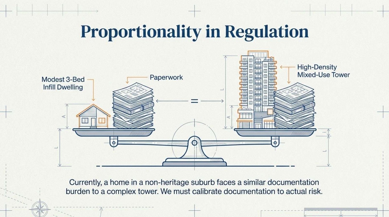 A modest infill dwelling in an established suburb receives levels of documentation burden more appropriate to a high-density mixed-use development. That absence of proportionality is where much of the inefficiency originates.