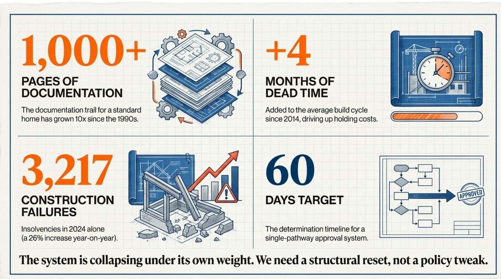 The housing system absorbed all of these pressures simultaneously while its regulatory framework continued to generate delay.