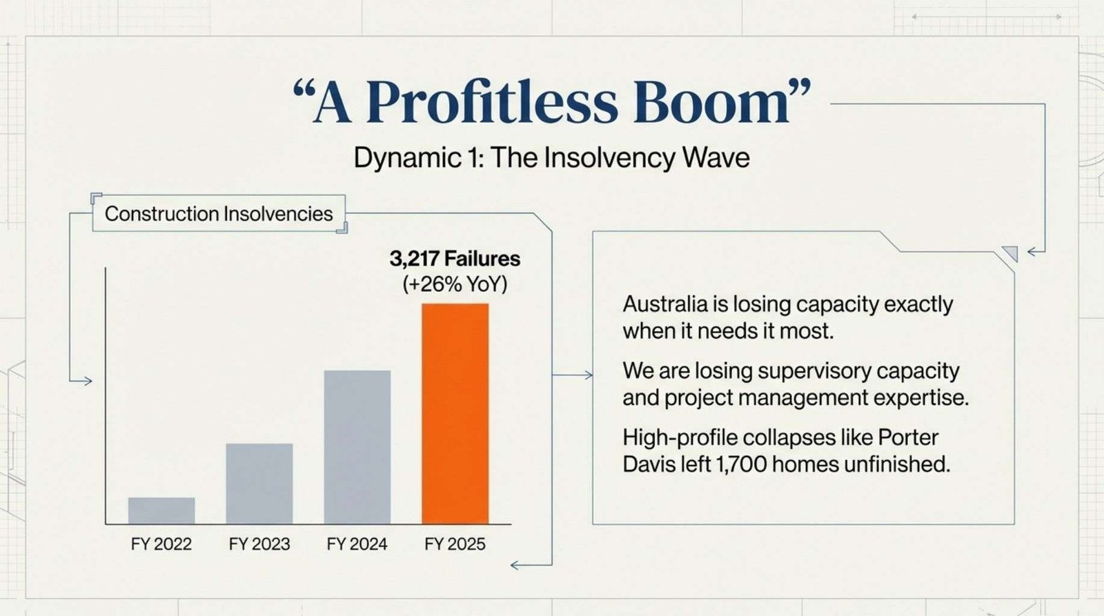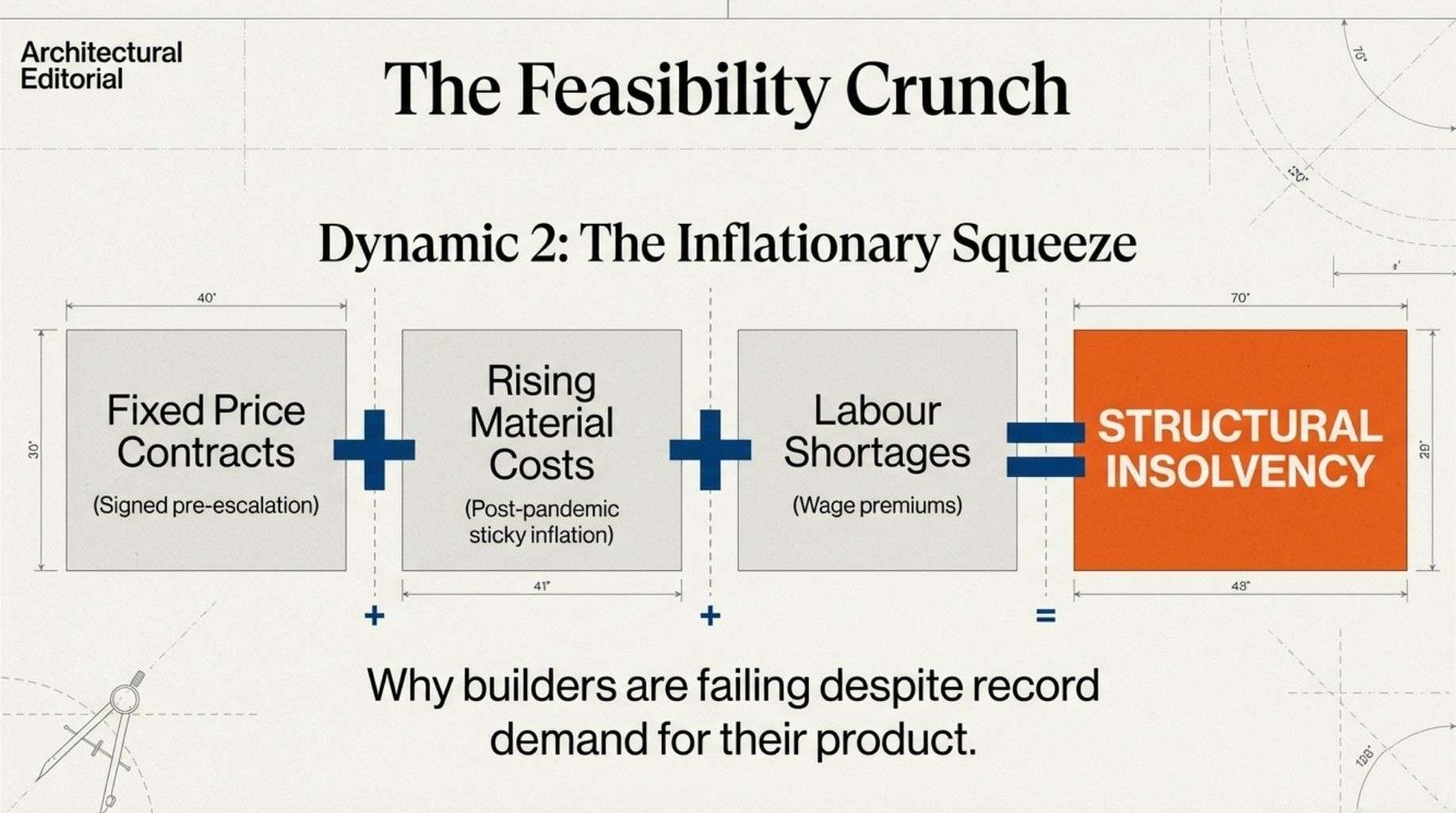 Four dynamics in particular have reshaped the operating environment: the insolvency wave, the widening timeline lag, the escalation of compliance costs and the structural mismatch between population growth and housing completions.