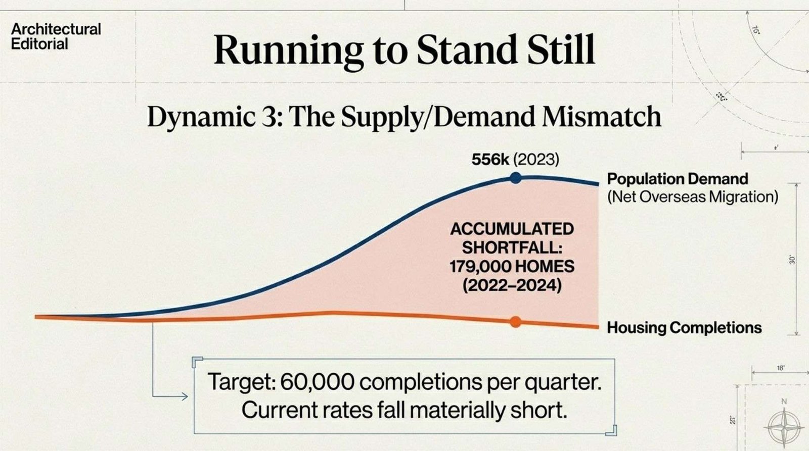 Population growth has outpaced housing completions for several years. The gap is now large enough to exert sustained pressure on rents, prices and household formation.